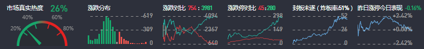 3、两市共754只个股上涨,45只个股涨停,3981只个股下跌,280只个股跌停,44只股票炸板,炸板率51%。