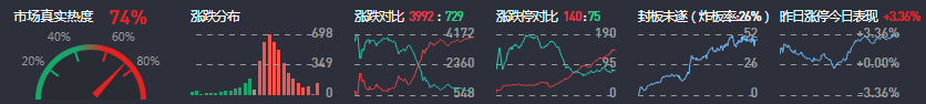 3、两市共3992只个股上涨,140只个股涨停,729只个股下跌,75只个股跌停,47只股票炸板,炸板率26%。