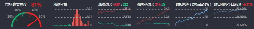3、两市共4489只个股上涨,247只个股涨停,262只个股下跌,32只个股跌停,40只股票炸板,炸板率16%。