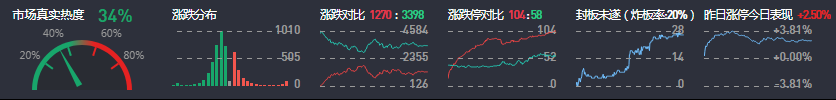 3、两市共1270只个股上涨,104只个股涨停,3398只个股下跌,58只个股跌停,23只股票炸板,炸板率20%。