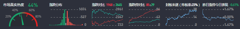 3、两市共1968只个股上涨,85只个股涨停,2645只个股下跌,29只个股跌停,18只股票炸板,炸板率23%。