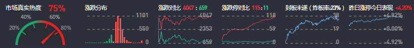 3、两市共4047只个股上涨,115只个股涨停,659只个股下跌,11只个股跌停,31只股票炸板,炸板率23%。