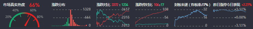 3、两市共3372只个股上涨,106只个股涨停,1234只个股下跌,17只个股跌停,22只股票炸板,炸板率17%。