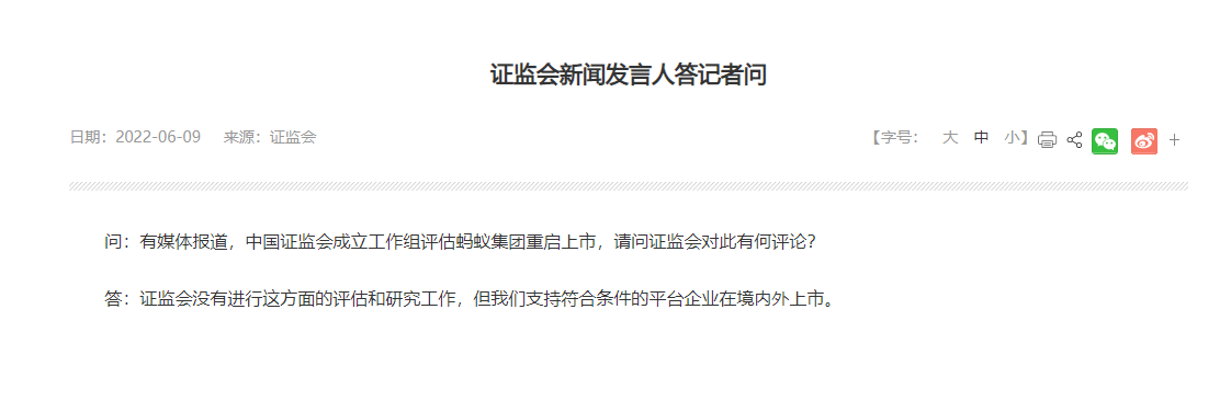 证监会:没有进行蚂蚁集团重启上市的评估和研究工作 有媒体报道,中国证监会成立工作组评估蚂蚁集团重启上市。证监会新闻发言人答记者问:证监会没有进行这方面的评估和研究工作,但我们支持符合条件的平台企业在境内外上市。 风险提示及免责条款 市场有风险,投资需谨慎。本文不构成个人投资建议,也未考虑到个别用户特殊的投资目标、财务状况或需要。用户应考虑本文中的任何意见、观点或结论是否符合其特定状况。据此投资,责任自负。