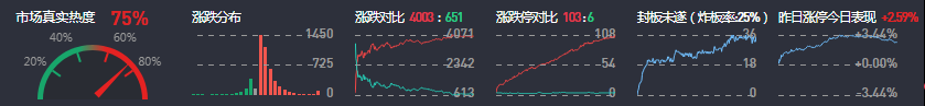3、两市共4003只个股上涨,103只个股涨停,651只个股下跌,6只个股跌停,33只股票炸板,炸板率25%。