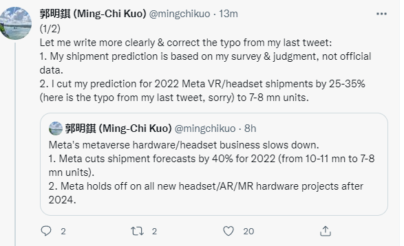 郭明錤更正:预测2022年Meta VR/耳机出货量下调25-35% 天风国际分析师郭明錤再次发文表示,此前发货预测是基于调查和判断,而不是官方数据。更正预测2022年Meta VR/耳机出货量下调25-35%(此前为40%)到700万-800万。 风险提示及免责条款 市场有风险,投资需谨慎。本文不构成个人投资建议,也未考虑到个别用户特殊的投资目标、财务状况或需要。用户应考虑本文中的任何意见、观点或结论是否符合其特定状况。据此投资,责任自负。