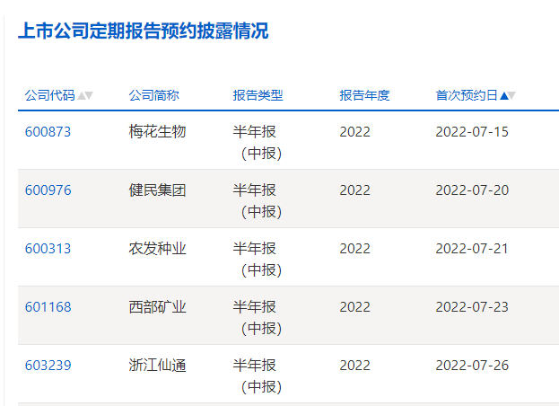 上交所上市公司半年报预约披露时间出炉,梅花生物拔得头筹,将于7月15日率先披露;健民集团7月20日披露,农发种业7月21号披露。 风险提示及免责条款 市场有风险,投资需谨慎。本文不构成个人投资建议,也未考虑到个别用户特殊的投资目标、财务状况或需要。用户应考虑本文中的任何意见、观点或结论是否符合其特定状况。据此投资,责任自负。