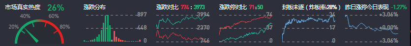 3、两市共774只个股上涨,71只个股涨停,3973只个股下跌,50只个股跌停,28只股票炸板,炸板率28%。