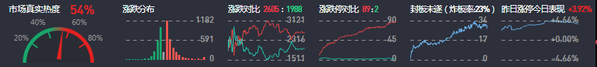 3、两市共2605只个股上涨,89只个股涨停,1988只个股下跌,2只个股跌停,23只股票炸板,炸板率23%。