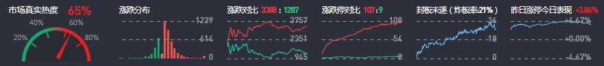 3、两市共3388只个股上涨,107只个股涨停,1287只个股下跌,9只个股跌停,28只股票炸板,炸板率21%。
