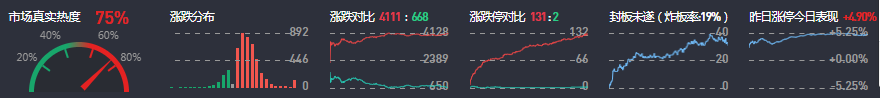 3、两市共4111只个股上涨,131只个股涨停,668只个股下跌,2只个股跌停,27只股票炸板,炸板率19%。