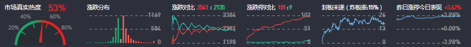 3、两市共2541只个股上涨,101只个股涨停,2135只个股下跌,9只个股跌停,17只股票炸板,炸板率15%。