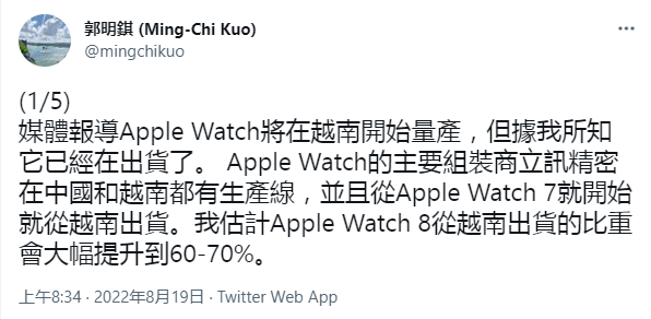 郭明錤在社交媒体上表示,“媒体报道Apple Watch将在越南开始量产,但据我所知它已经在出货了。Apple Watch的主要组装商立讯精密在中国和越南都有生产线,并且从Apple Watch 7就开始就从越南出货。我估计Apple Watch 8从越南出货的比重会大幅提升到60-70%。”