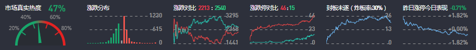 3、两市共2213只个股上涨,46只个股涨停,2540只个股下跌,15只个股跌停,16只股票炸板,炸板率30%。