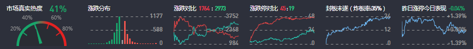 3、两市共1764只个股上涨,45只个股涨停,2973只个股下跌,19只个股跌停,20只股票炸板,炸板率35%。