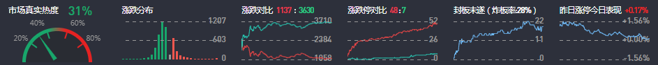 3、两市共1137只个股上涨,48只个股涨停,3630只个股下跌,7只个股跌停,14只股票炸板,炸板率28%。