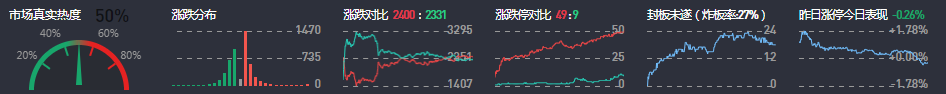 3、两市共2400只个股上涨,49只个股涨停,2331只个股下跌,9只个股跌停,16只股票炸板,炸板率27%。