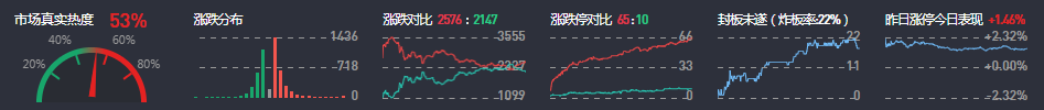3、两市共2576只个股上涨,65只个股涨停,2147只个股下跌,10只个股跌停,11只股票炸板,炸板率22%。
