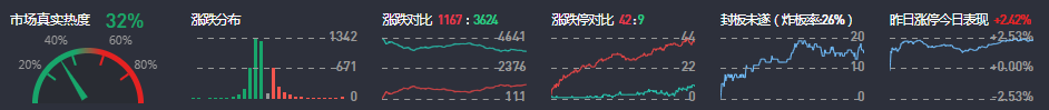 3、两市共1168只个股上涨,42只个股涨停,3426只个股下跌,9只个股跌停,11只股票炸板,炸板率26%。