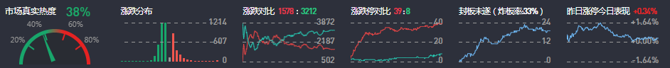 3、两市共1578只个股上涨,39只个股涨停,3212只个股下跌,8只个股跌停,18只股票炸板,炸板率33%。