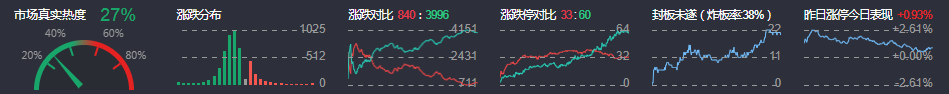 3、两市共840只个股上涨,33只个股涨停,3996只个股下跌,60只个股跌停,18只股票炸板,炸板率38%。