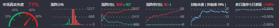 3、两市共3935只个股上涨,96只个股涨停,907只个股下跌,4只个股跌停,18只股票炸板,炸板率19%。
