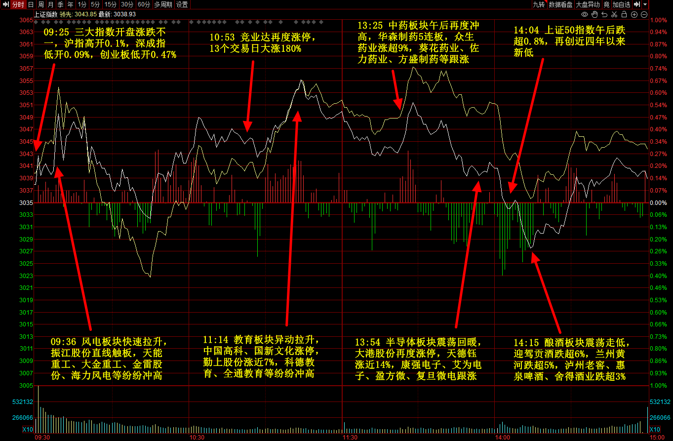 主力净流入行业板块前五:风电,特高压,火电,3D玻璃,教育;