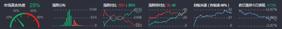 3、两市共1017只个股上涨,36只个股涨停,3874只个股下跌,40只个股跌停,33只股票炸板,炸板率48%。