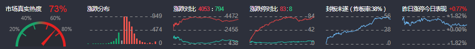 3、两市共4053只个股上涨,83只个股涨停,794只个股下跌,8只个股跌停,只股票炸板,炸板率%。