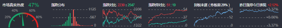 3、两市共2230只个股上涨,51只个股涨停,2547只个股下跌,19只个股跌停,20只股票炸板,炸板率29%。