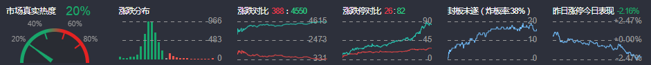 3、两市共388只个股上涨,26只个股涨停,4550只个股下跌,82只个股跌停,13只股票炸板,炸板率38%。