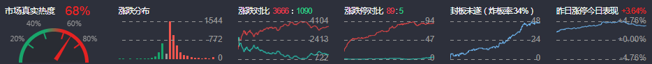 3、两市共3666只个股上涨,89只个股涨停,1090只个股下跌,5只个股跌停,35只股票炸板,炸板率34%。