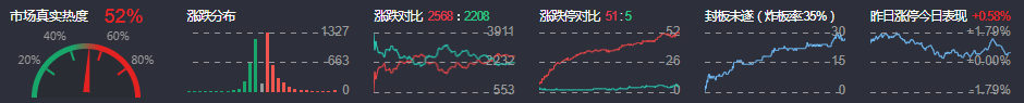 3、两市共2568只个股上涨,51只个股涨停,2208只个股下跌,5只个股跌停,24只股票炸板,炸板率35%。