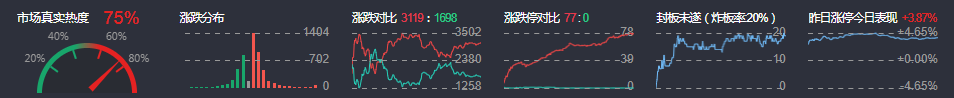 3、两市共3119只个股上涨,77只个股涨停,1698只个股下跌,无个股跌停,15只股票炸板,炸板率20%。