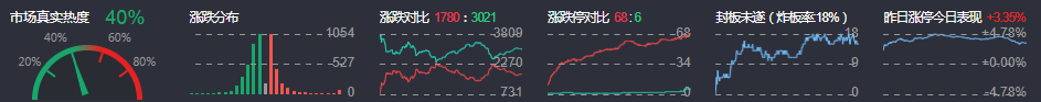 3、两市共1780只个股上涨,68只个股涨停,3021只个股下跌,68只个股跌停,6只股票炸板,炸板率18%。