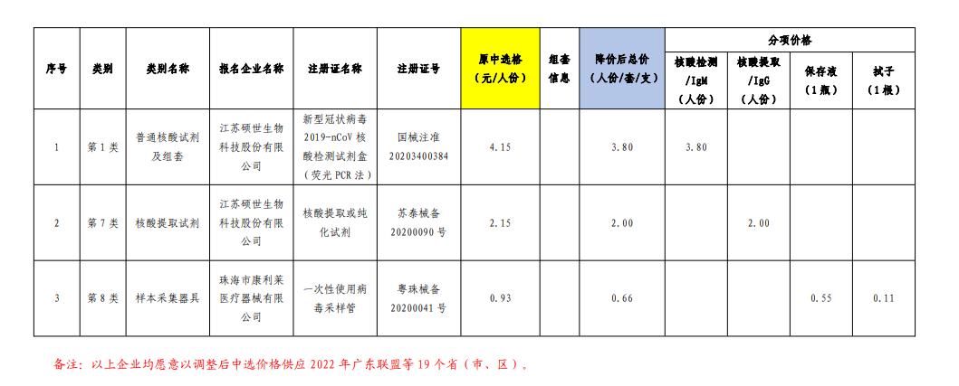 广东省药品交易中心下调江苏硕世等两家企业新冠病毒核酸检测试剂和配套耗材带量采购中选价格,调整后的价格自2022年11月17日起执行。 风险提示及免责条款 市场有风险,投资需谨慎。本文不构成个人投资建议,也未考虑到个别用户特殊的投资目标、财务状况或需要。用户应考虑本文中的任何意见、观点或结论是否符合其特定状况。据此投资,责任自负。