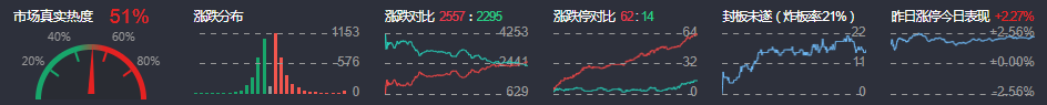 3、两市共2557只个股上涨,62只个股涨停,2295只个股下跌,14只个股跌停,13只股票炸板,炸板率21%。