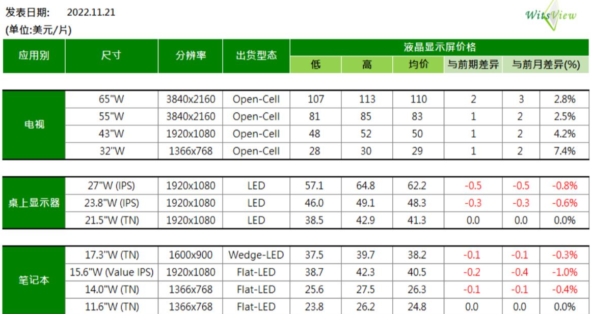 WitsView睿智显示调研数据,2022年11月下旬,电视面板全线涨价。 风险提示及免责条款 市场有风险,投资需谨慎。本文不构成个人投资建议,也未考虑到个别用户特殊的投资目标、财务状况或需要。用户应考虑本文中的任何意见、观点或结论是否符合其特定状况。据此投资,责任自负。