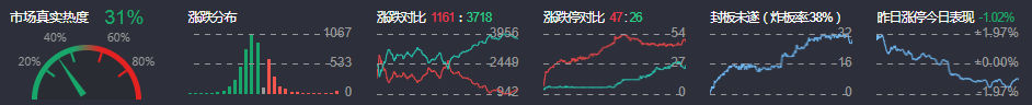3、两市共1161只个股上涨,47只个股涨停,3718只个股下跌,26只个股跌停,25只股票炸板,炸板率38%。