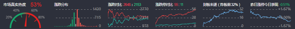 3、两市共2648只个股上涨,55只个股涨停,2153只个股下跌,11只个股跌停,26只股票炸板,炸板率32%。