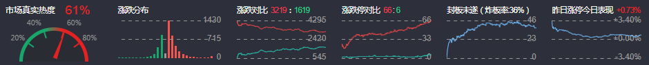 3、两市共3219只个股上涨,66只个股涨停,1619只个股下跌,6只个股跌停,30只股票炸板,炸板率36%。