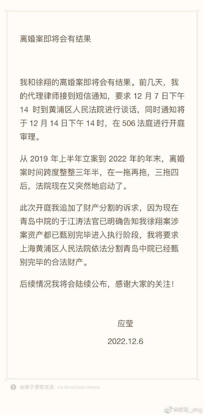 应莹发微博称,和徐翔的离婚案即将会有结果。 风险提示及免责条款 市场有风险,投资需谨慎。本文不构成个人投资建议,也未考虑到个别用户特殊的投资目标、财务状况或需要。用户应考虑本文中的任何意见、观点或结论是否符合其特定状况。据此投资,责任自负。