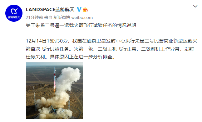 蓝箭航天发布关于朱雀二号遥一运载火箭飞行试验任务的情况说明 据LANDSPACE蓝箭航天官方微博:12月14日16时30分,我国在酒泉卫星发射中心执行朱雀二号民营商业新型运载火箭首次飞行试验任务。火箭一级、二级主机飞行正常,二级游机工作异常,发射任务失利。具体原因正在进一步分析排查。 风险提示及免责条款 市场有风险,投资需谨慎。本文不构成个人投资建议,也未考虑到个别用户特殊的投资目标、财务状况或需要。用户应考虑本文中的任何意见、观点或结论是否符合其特定状况。据此投资,责任自负。