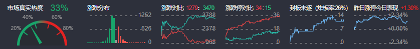 3、两市共1279只个股上涨,34只个股涨停,3470只个股下跌,15只个股跌停,11只股票炸板,炸板率26%。