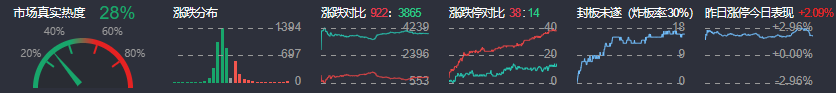 3、两市共922只个股上涨,38只个股涨停,3865只个股下跌,14只个股跌停,15只股票炸板,炸板率30%。