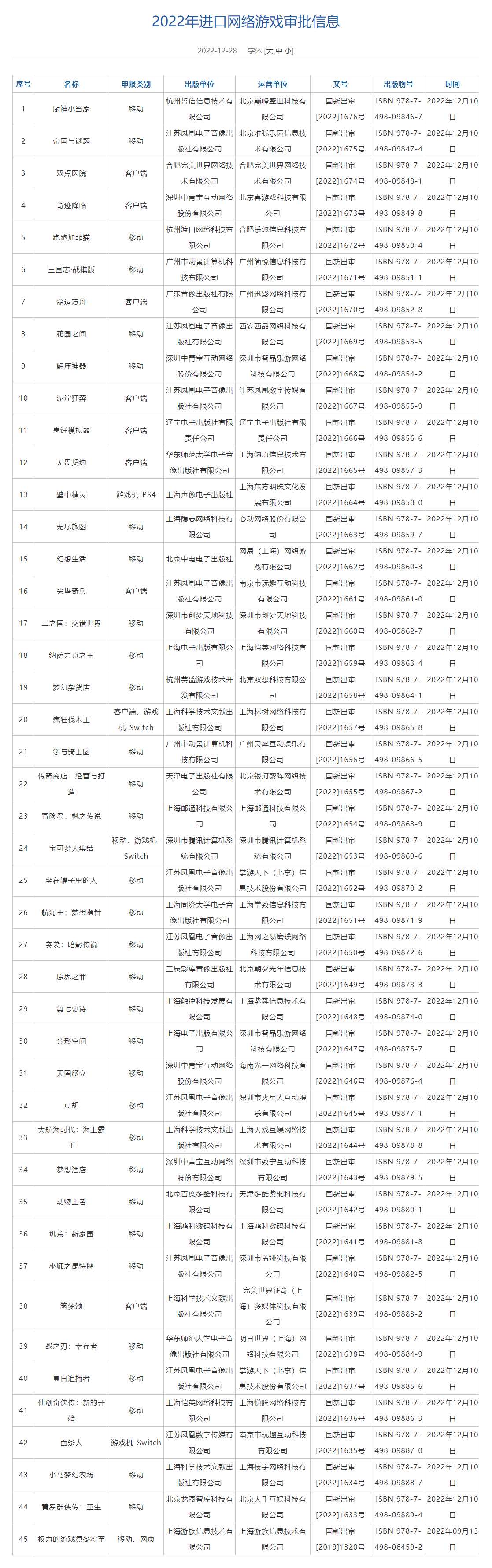 国家新闻出版署发布2022年进口网络游戏审批信息,共45款游戏获批。 风险提示及免责条款 市场有风险,投资需谨慎。本文不构成个人投资建议,也未考虑到个别用户特殊的投资目标、财务状况或需要。用户应考虑本文中的任何意见、观点或结论是否符合其特定状况。据此投资,责任自负。