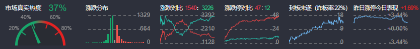 3、两市共1540只个股上涨,47只个股涨停,3226只个股下跌,12只个股跌停,12只股票炸板,炸板率12%。