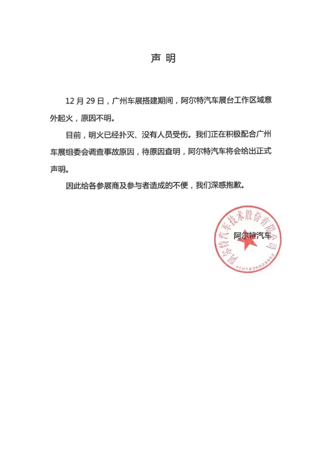阿尔特汽车就“广州车展展馆现场起火”发布声明:正积极配合调查事故原因 IAT汽车微信公众号发布声明表示,12月29日,广州车展搭建期间,阿尔特汽车展台工作区域意外起火,原因不明。目前,明火已经扑灭、没有人员受伤。阿尔特正在积极配合广州车展组委会调查事故原因,待原因查明,阿尔特汽车将会给出正式声明。 风险提示及免责条款 市场有风险,投资需谨慎。本文不构成个人投资建议,也未考虑到个别用户特殊的投资目标、财务状况或需要。用户应考虑本文中的任何意见、观点或结论是否符合其特定状况。据此投资,责任自负。