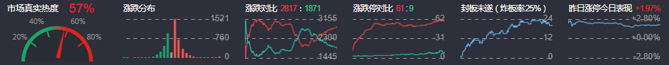 3、两市共2817只个股上涨,61只个股涨停,1871只个股下跌,9只个股跌停,18只股票炸板,炸板率25%。