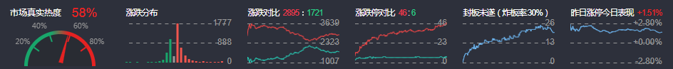 3、两市共2895只个股上涨,46只个股涨停,1721只个股下跌,6只个股跌停,18只股票炸板,炸板率30%。